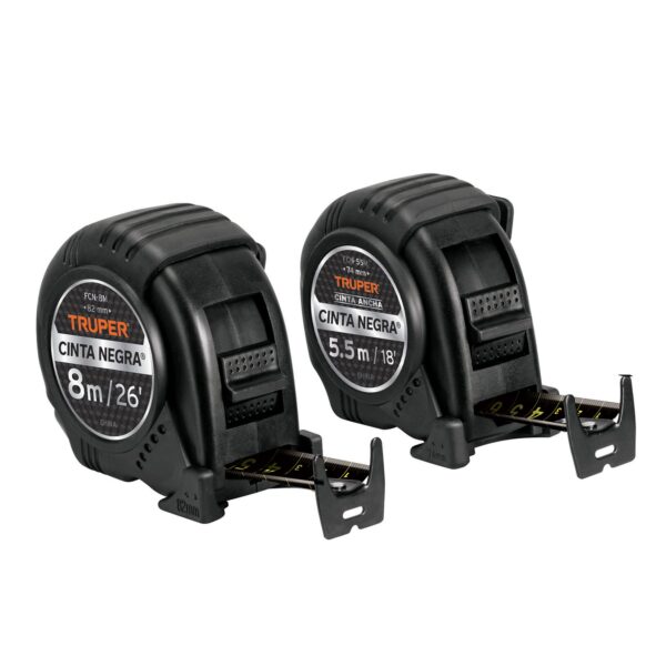 Cinta extra ancha que permite mayor extensión, impresa por ambos lados, fabricada en acero negro resistente a la corrosión (Números grandes de fácil lectura / graduación vertical y horizontal)